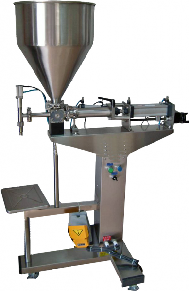 Se trata de una máquina para dosificar toda clase de líquidos fluidos y viscosos tales como: agua, vino, aceite, vinagre, bebidas, zumos, etc. También puede dosificar productos viscosos y densos como: gel, champu, cremas, salsas, patés, etc. Se puede ajustar el volumen de la dosificación y puede trabajar con accionamiento manual o automático, pudiendo regular el ritmo o frecuencia del dosificado.